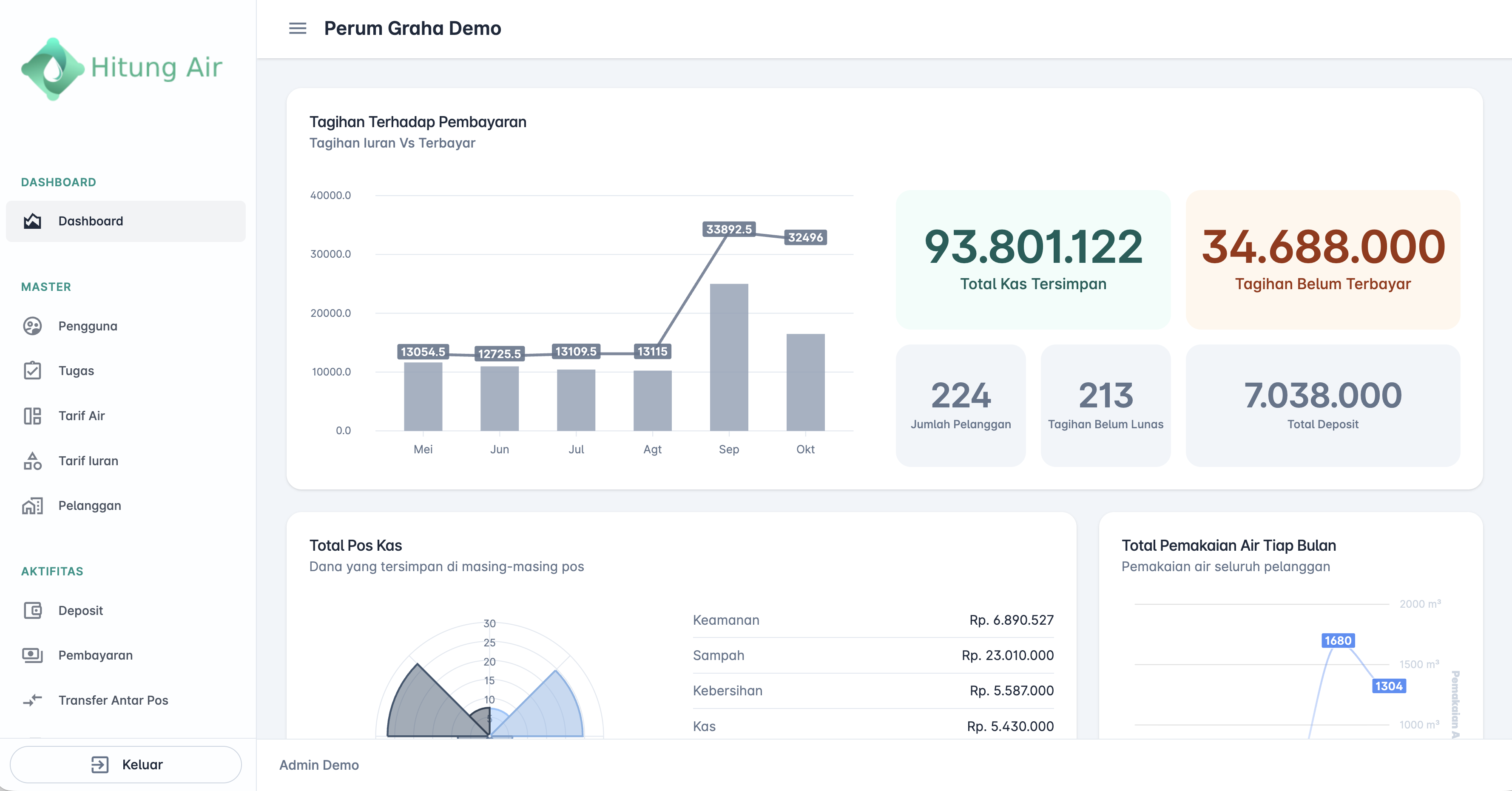 Dashboard HitungAir menampilkan data pemakaian air secara real-time dalam bentuk grafik yang mudah dipahami. Dengan tampilan visual yang interaktif, Anda dapat memantau tren konsumsi, tagihan, dan laporan keuangan dengan cepat dan akurat.