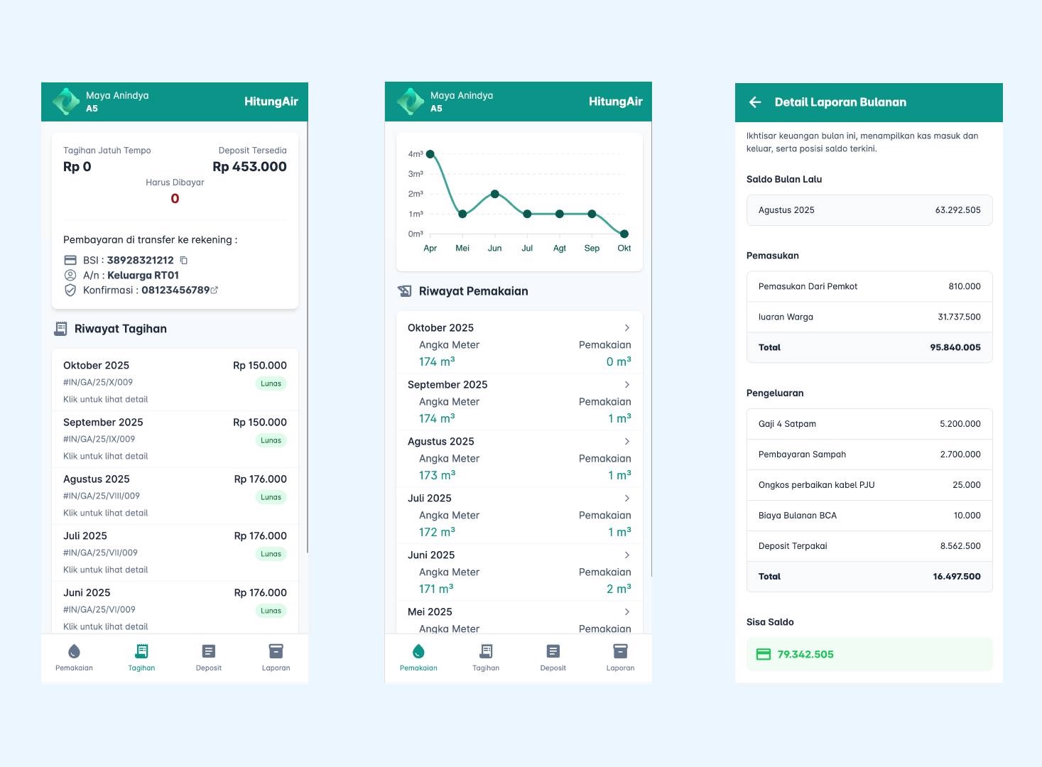 Aplikasi pelanggan HitungAir memudahkan pengguna dalam memantau pemakaian air, melihat tagihan bulanan, serta mengecek saldo deposit secara langsung. Dilengkapi laporan bulanan yang rapi dan transparan, setiap pelanggan dapat mengontrol penggunaan dan pembayaran dengan mudah di satu aplikasi.