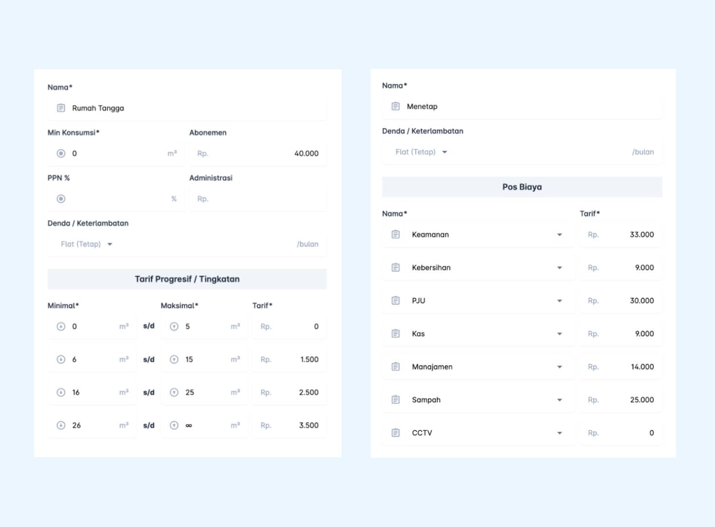 Setiap POS Kas (seperti keamanan, biaya kebersihan, kas sosial dan lainnya) dapat dengan mudah diatur sehingga pencatatan keuangan menjadi lebih terstruktur dan tertata rapi. Selain itu, tarif abonemen dan tarif pemakaian bertingkat dapat diatur secara dinamis.